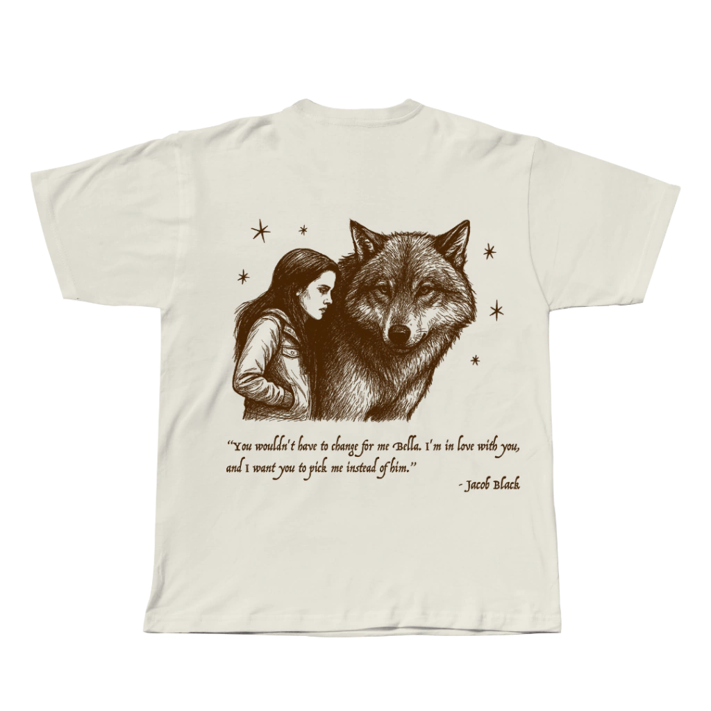 Se o seu coração sempre pertenceu ao lado da alcateia, a Camiseta Team Jacob é para você! Com retrato artístico do personagem e a frase “I run with wolves”, ela celebra os fãs que escolheram Jacob Black como o verdadeiro herói da saga.
