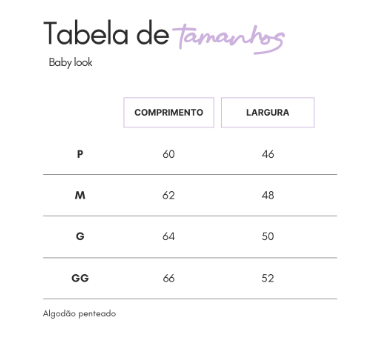 · Disponível nos tamanhos: Camiseta - P, M, G, GG, G1/G2, G3/G4 e G5/G7 e Babylook - P, M, G e GG.